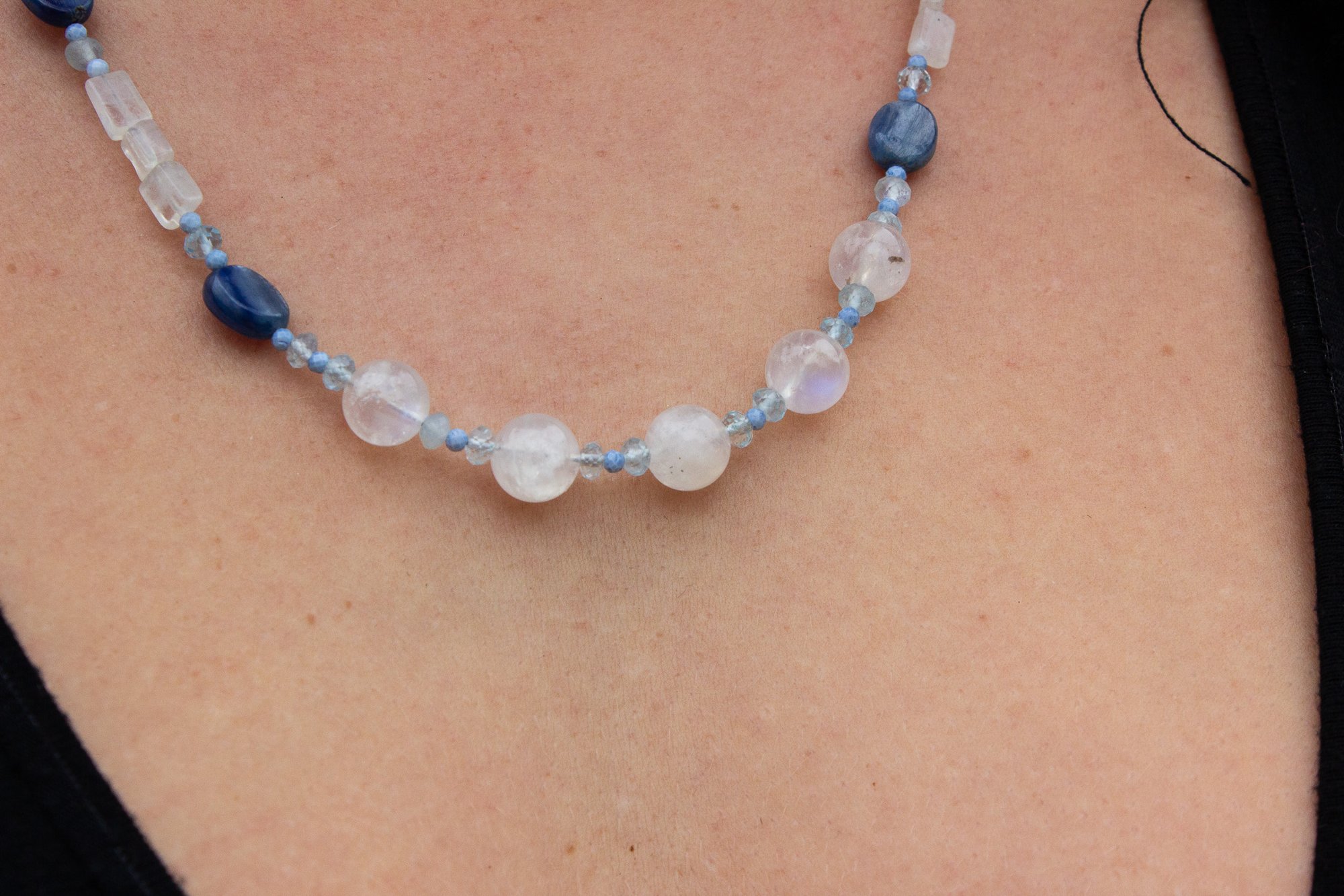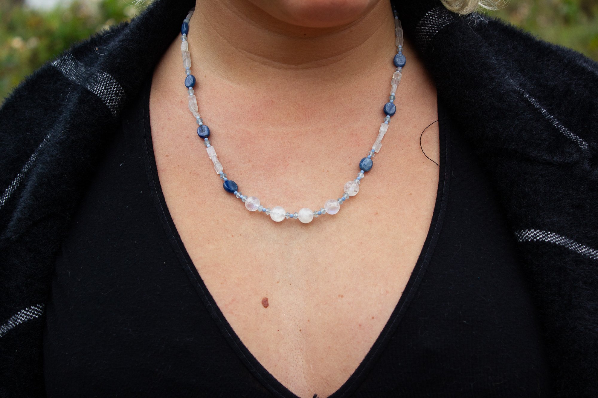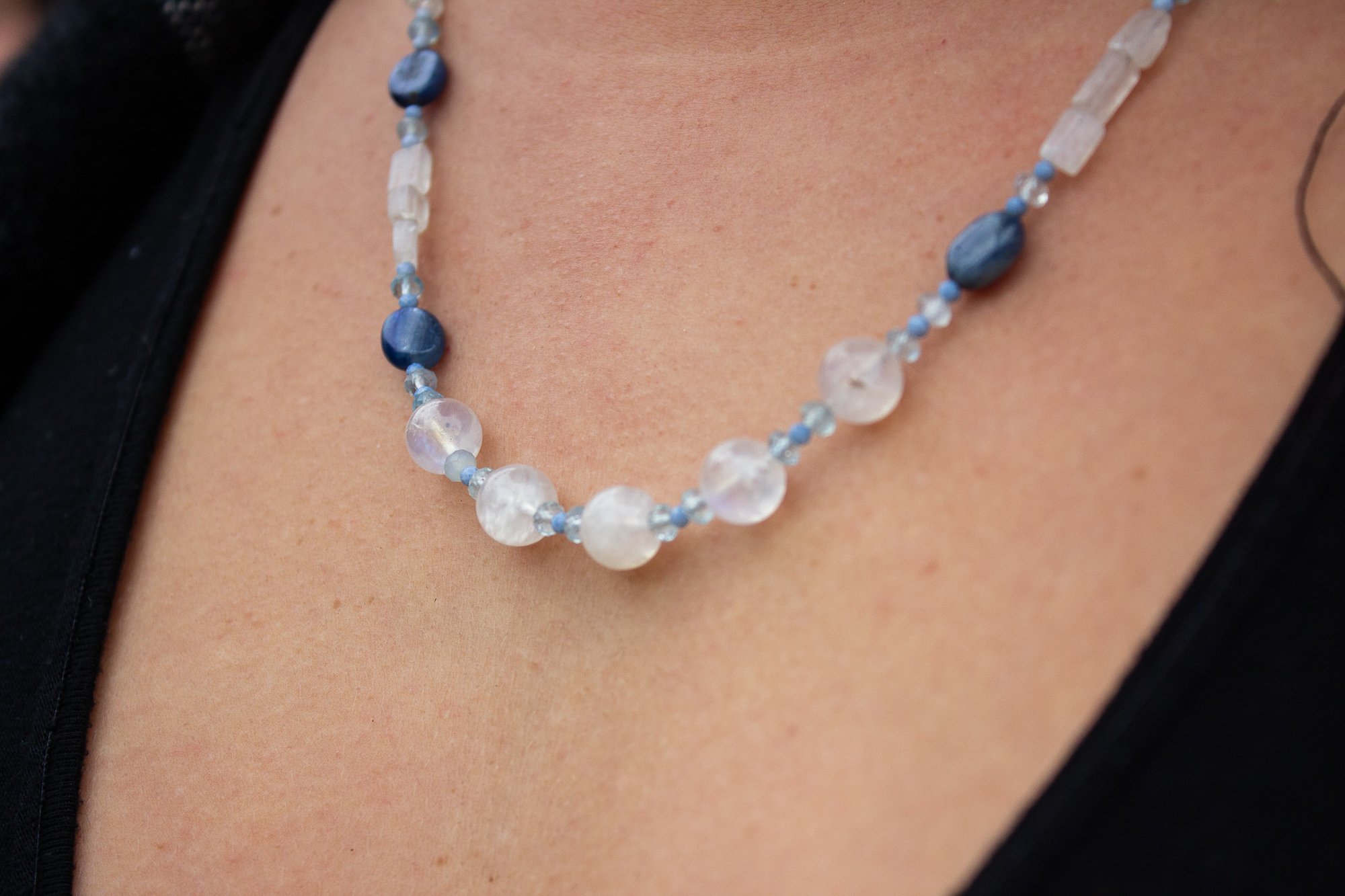 A serene blend of Moonstone, Blue Kyanite, Aquamarine, and Andean Blue Opal — crafted to feel like soft light rippling across clear coastal waters. This piece holds gentle, cleansing, intuitive energy, perfect for anyone who feels called to the deep understanding.