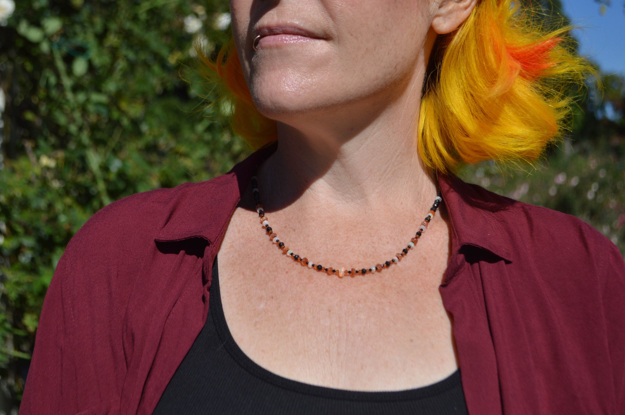 Handcrafted with Ethiopian Welo Opal, Oregon Sunstone, Hessonite Garnet, and Black Spinel — a radiant harmony of grounding and fire.